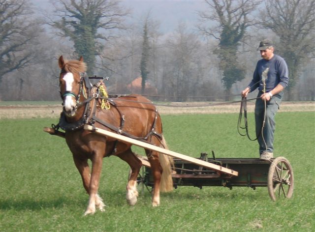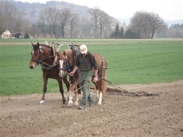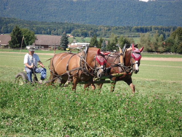Unsere Pferde werden noch bei landwirtschaftlichen Arbeiten eingesetzt. Auch bilde ich Feldtestpferde zum Fahren aus und biete Holzrücken und Fahrkurse an.