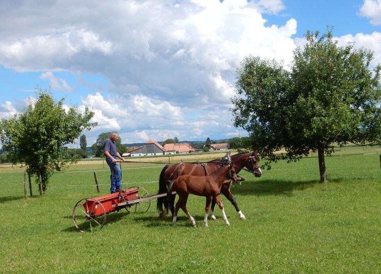 z.B. Holzrücken, Gymkhanas, Hindernisfahren und Gesellschaftsfahrten. Dabei laufen die Fohlen wenn möglich mit und lernen seit die verschiedenen Geräusche kennen. Da unser Hof an einer Hauptstrasse liegt, kennen alle Pferde auch den Strassenverkehr.